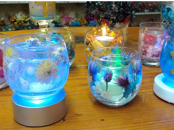 キャンドル1番人気★ガラスの大小2個の器の隙間に使い放題のドライフラワーを入れ、透明の柔らかいゼリー状の「ジェルキャンドル」を注いで固める体験です。透明なキャンドルですので中が見やすくプクプクした泡と花材がとても綺麗に見えます!