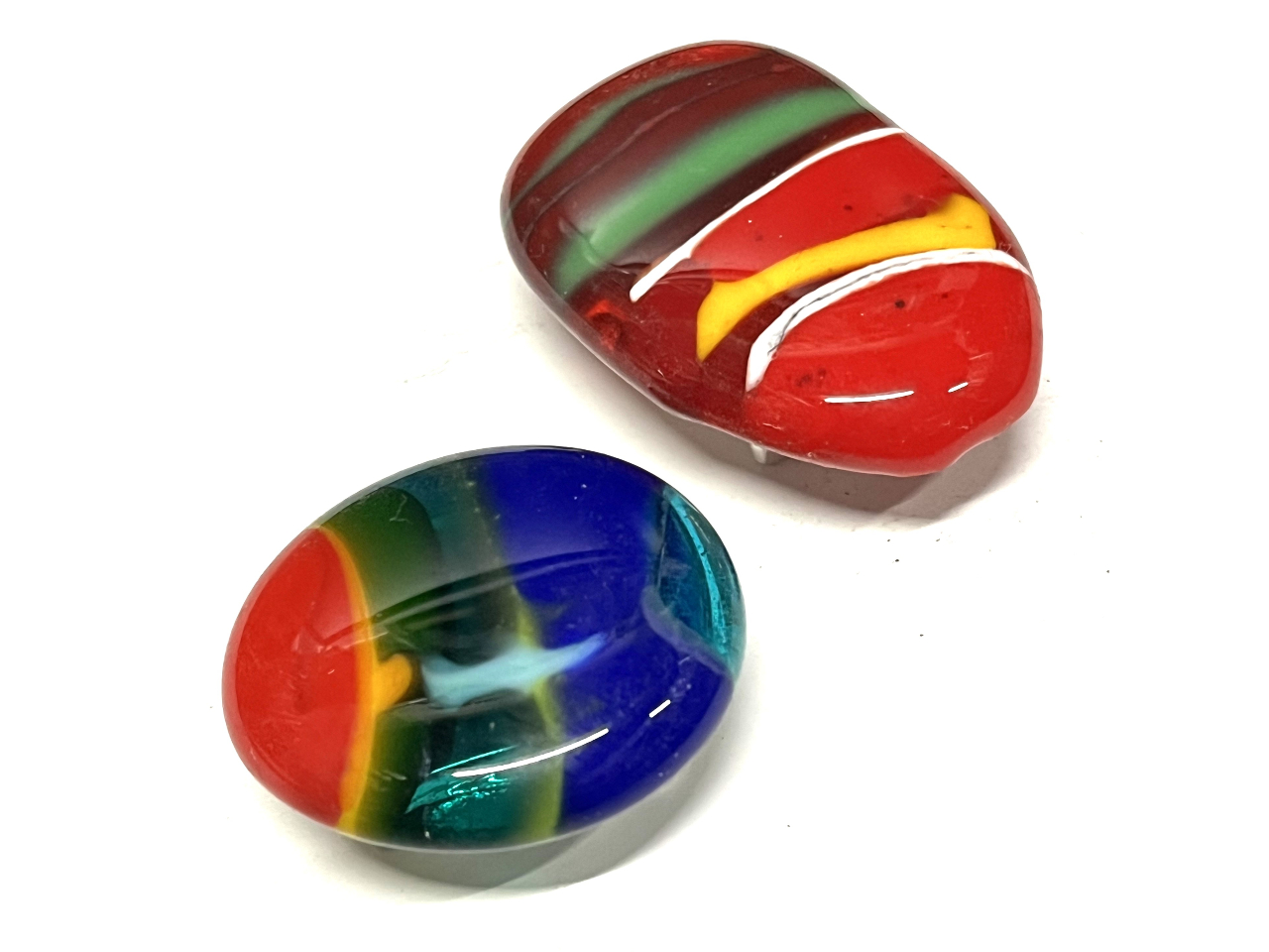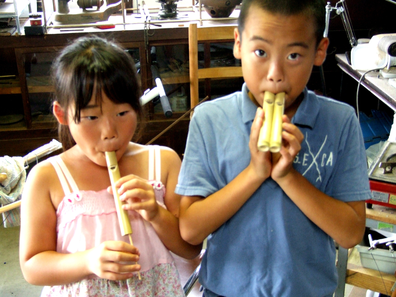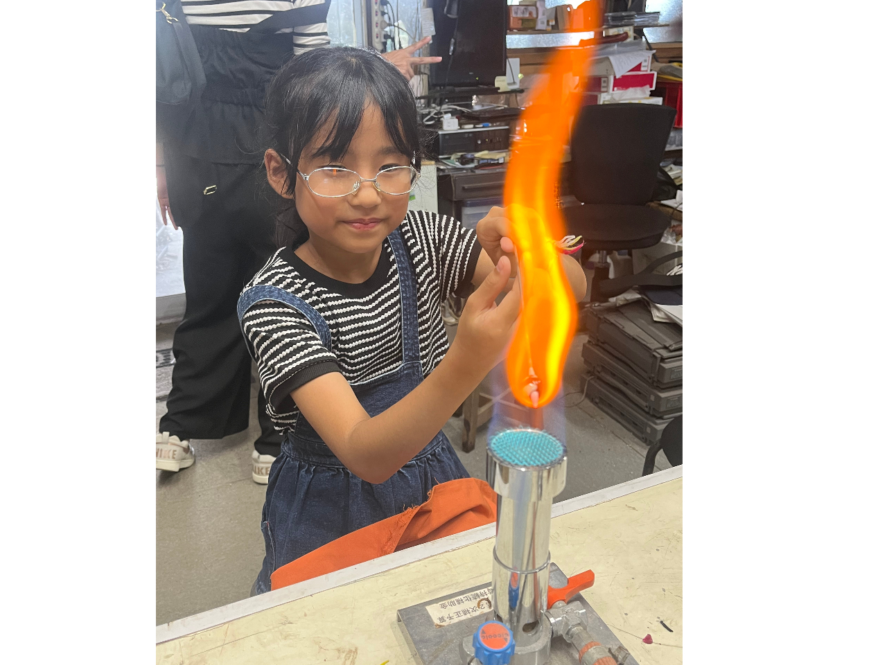 ガラスの棒をガスバーナーで溶かし、ガラスのとんぼ玉とイヤリング2個作ります