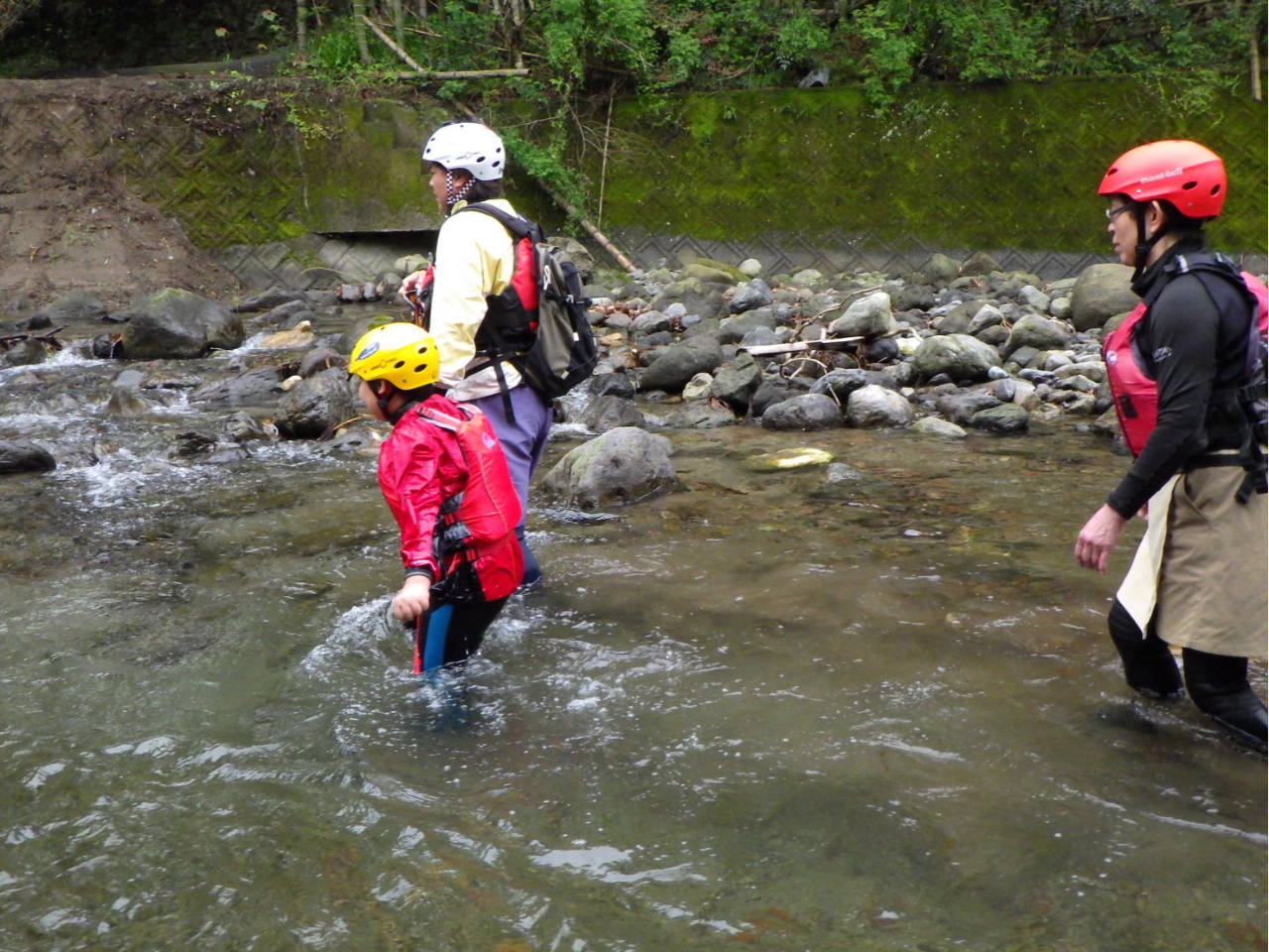 ヘルメット、ライフジャケット、ウェットブーツ、ロングジョンタイプのウェットスーツ(袖無し)