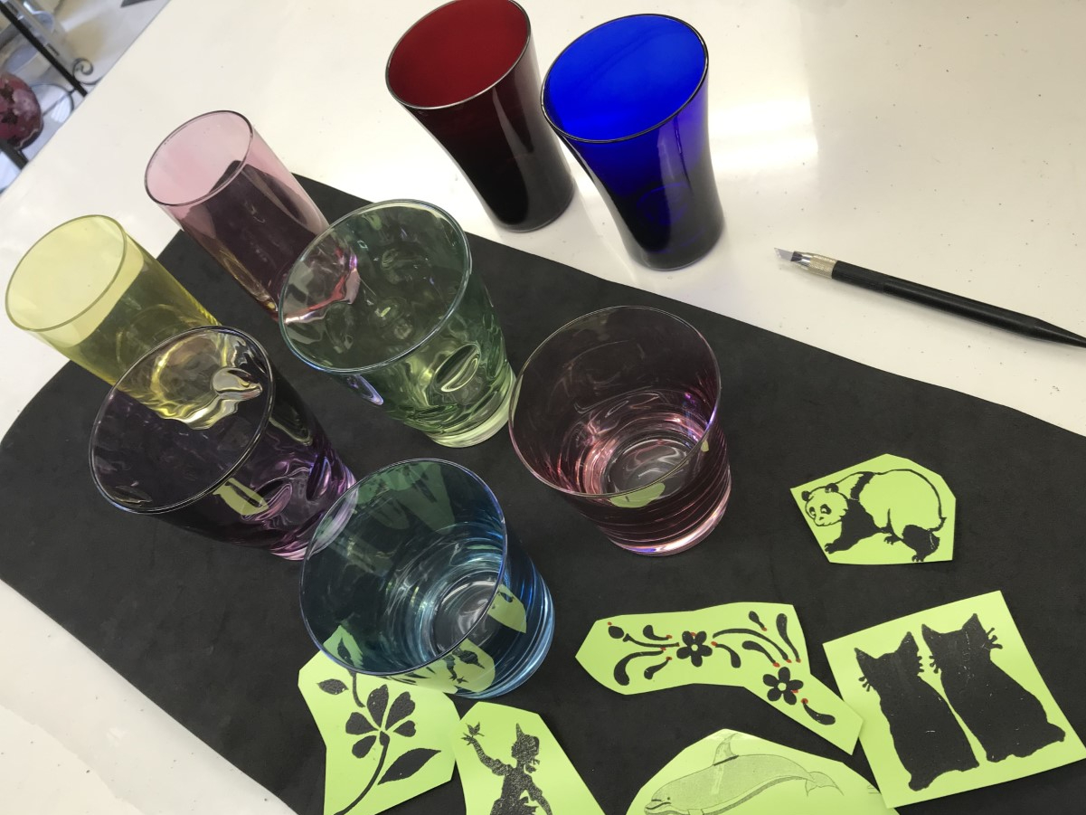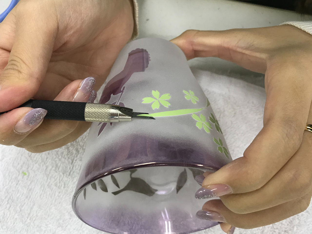 絵柄をグラスの表面に貼ってカッターで切り残します。
