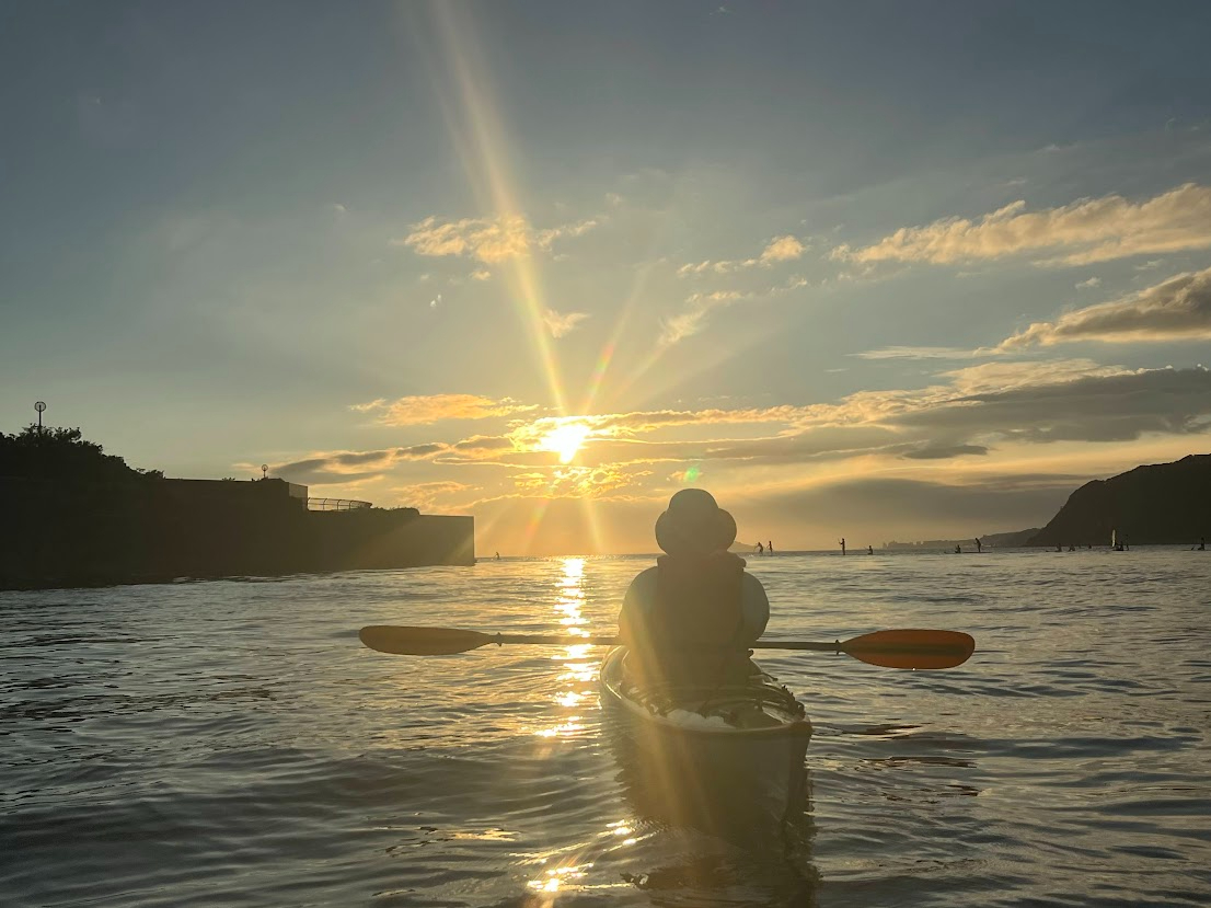【逗子・葉山・スタッフおすすめのサンセットシーカヤック】夕日が映える、癒される時間。アメニティ充実、バスタオル完備の施設でシーカヤック サンセットコース