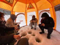これぞ北海道の冬のアクティビティ一1番人気。カラフルテントの中で楽しむワカサギフィッシングを。