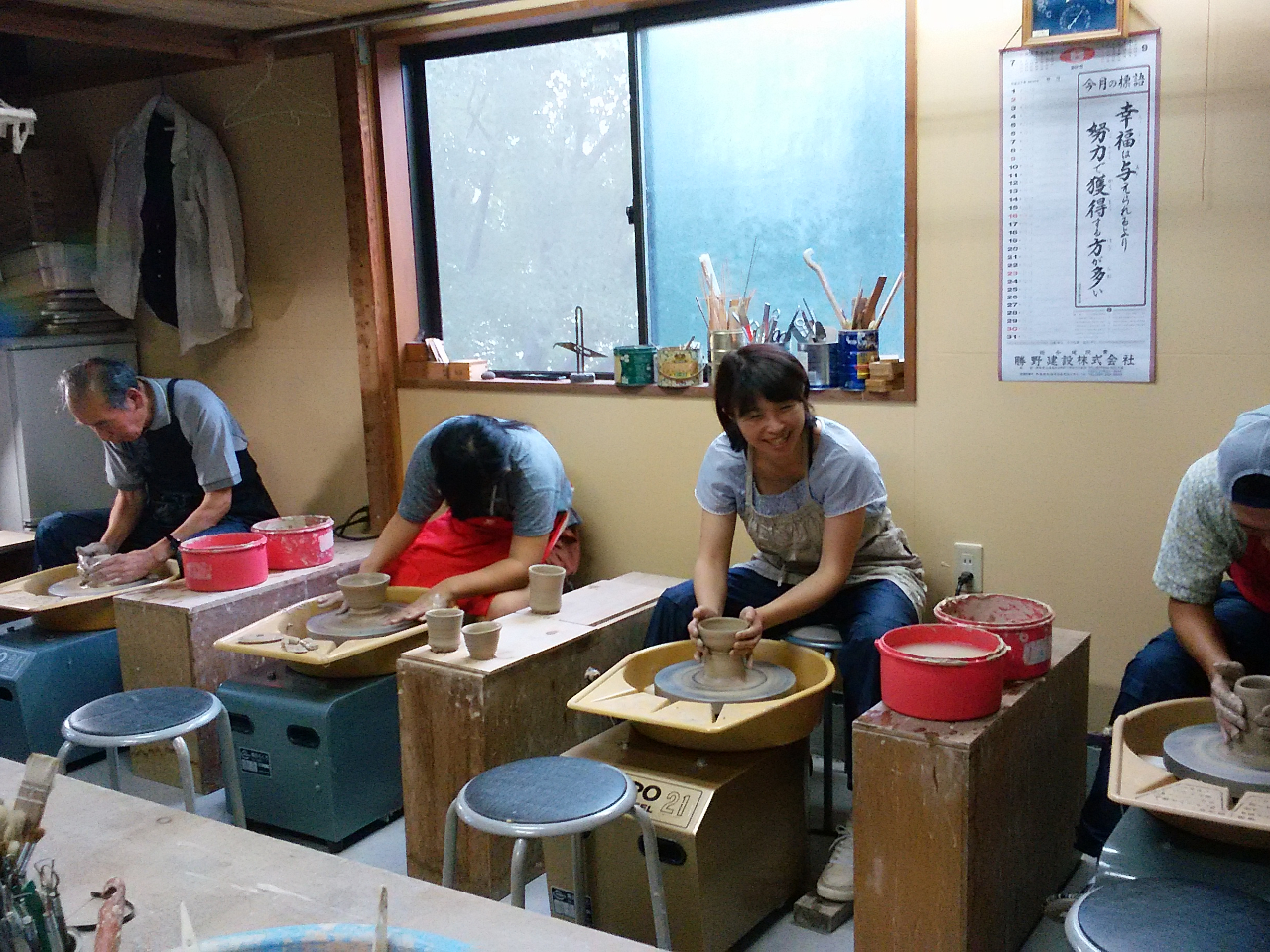 電動ロクロは最大七台ありますので、ご家族、女性同士、グループなどに喜ばれています。嬉しいコーヒー付き♪