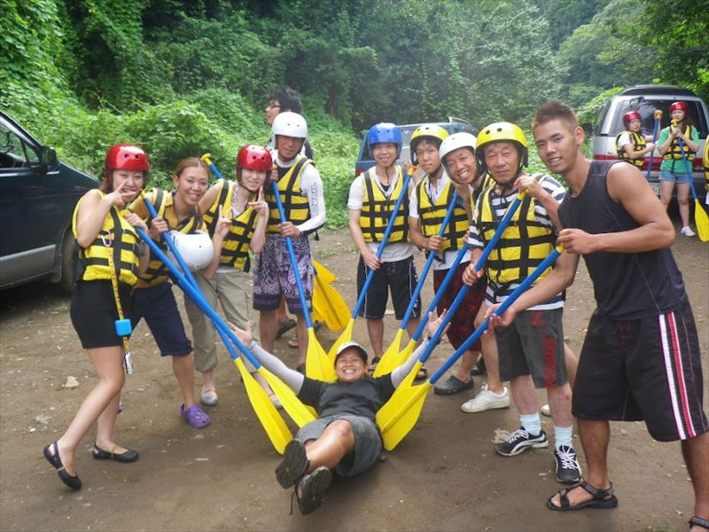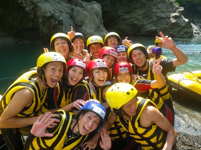 8人乗りの特殊なゴムボートに乗り、みんなで力を合わせて激流をクリアしていきます。