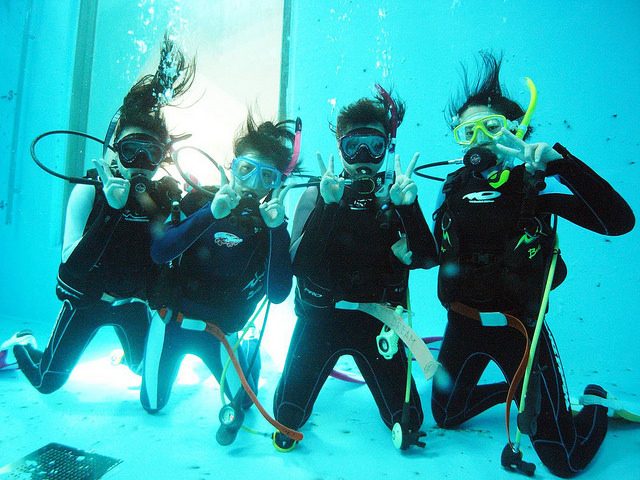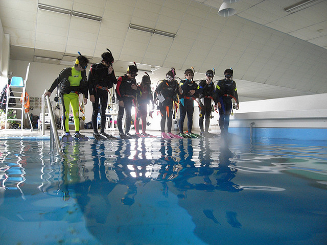 潜水の仕方、耳抜きの方法、器材のセットの仕方、水中でのバランスのとり方など、