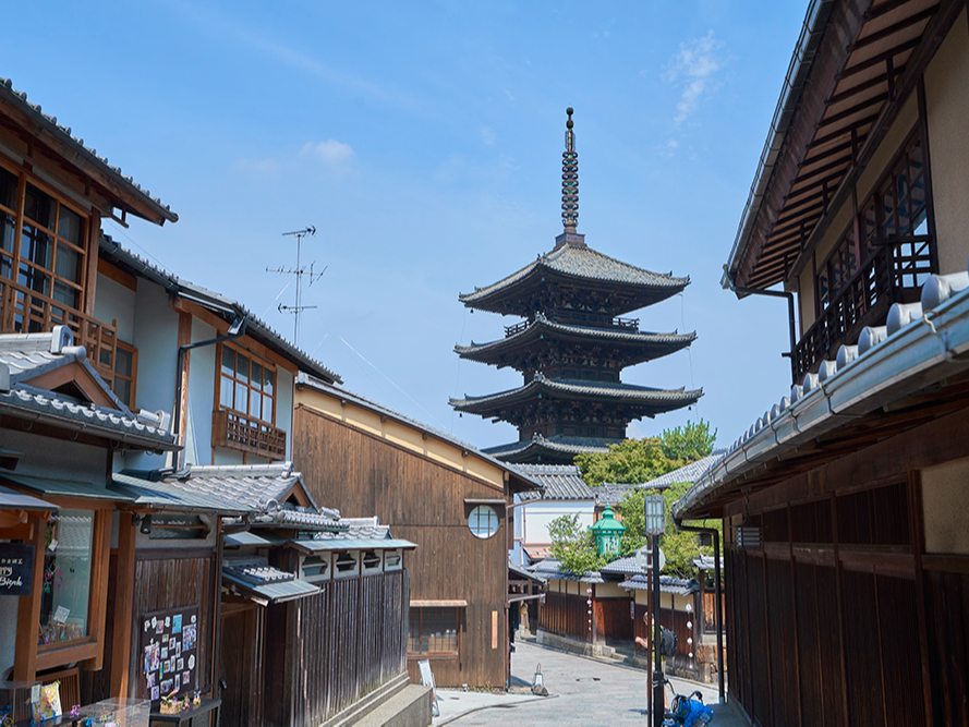 窓から見上げる「八坂の塔」。石畳の路や人力車など、風情ある京都の景観が広がる絶好のロケーションです。
