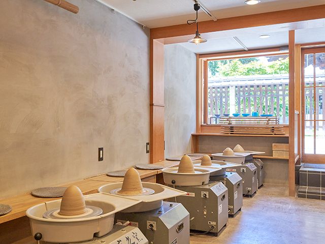 ロクロが並ぶ店内。老若男女が一緒に楽しめるロクロ体験は、修学旅行や社員旅行にも最適です。