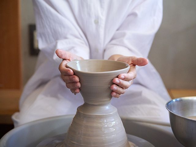 くるくる回る粘土を集中して成形するのが電動ろくろ特有の楽しみ方。