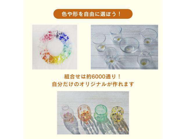 こだわりの作品を、お気に入りの色で作るガラスアート♪グラス、花瓶、うつわ、片口などの中から形を決めて、ピンクやイエロー、パープルなど、約17色の多彩なカラーバリエーションの中から好きな色を何色でも選んでいただき、混ぜて、製作します。
