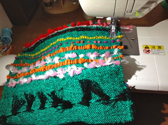 私は旦那と隣り合わせで織り機を使い、巾着を作りました。