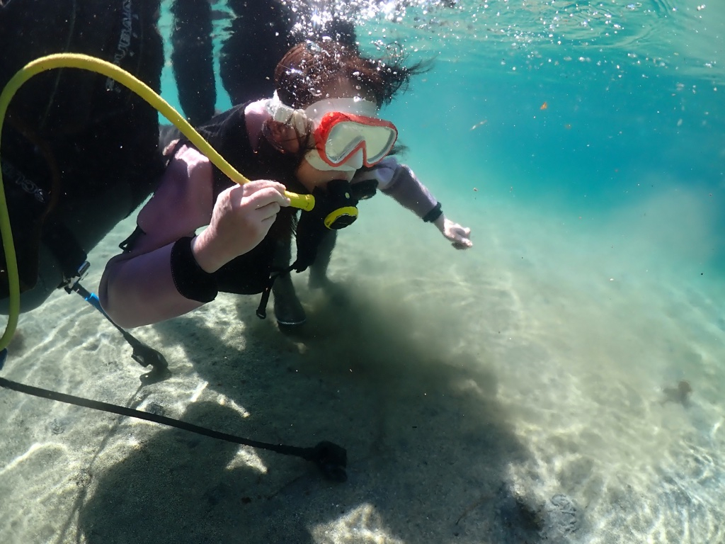 あり 背の立つ浅瀬でスクーバ器材を使って呼吸や耳抜き、水中の対処法など、楽しむためのコツを練習します。 |