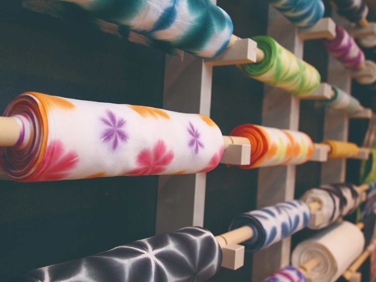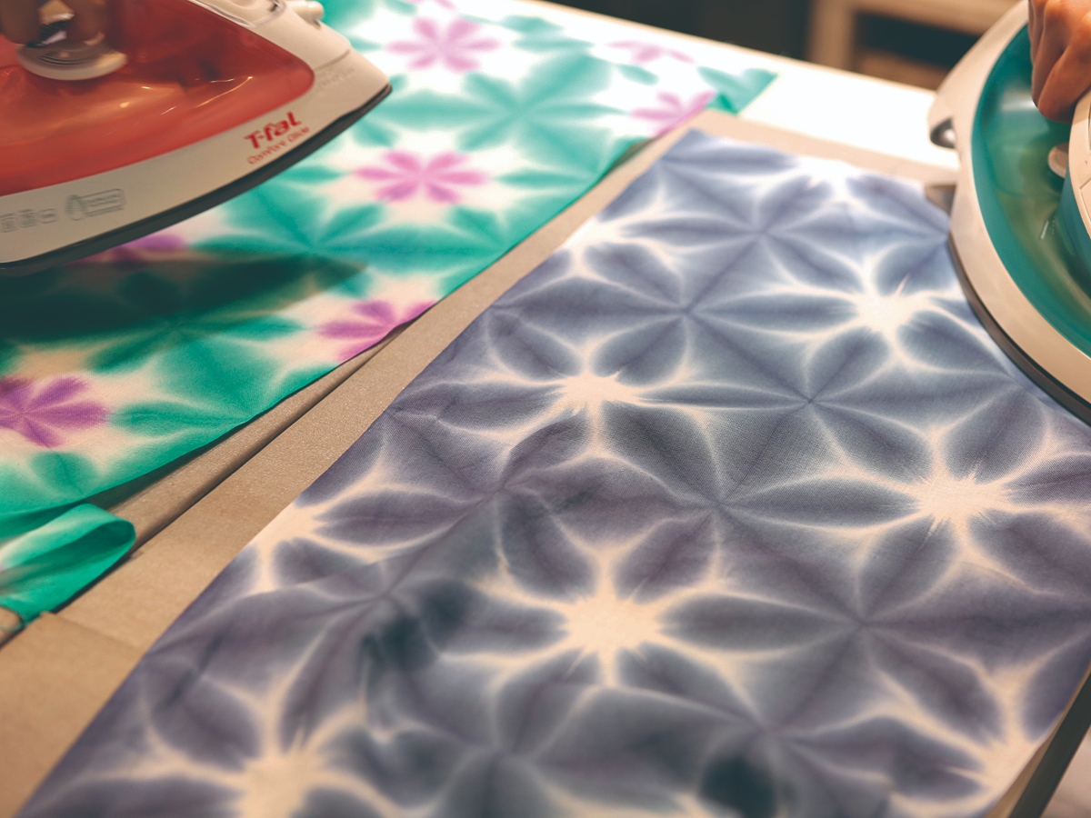 雪花絞りは、生地を三角に折りたたみ、三角形の底辺や角を染料に少し浸ける技法です。