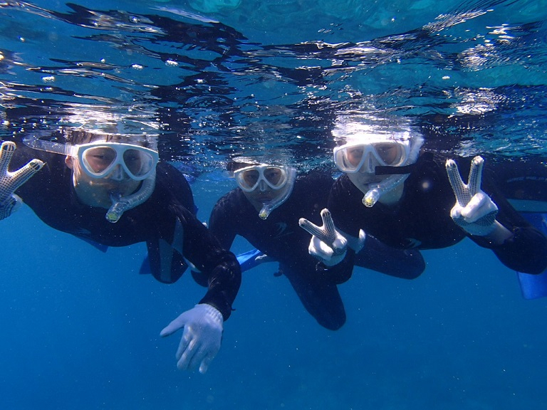 スノーケリングはダイビングに比べて気軽に参加できてグループに最適。みんなでワイワイ海遊びしましょう♪