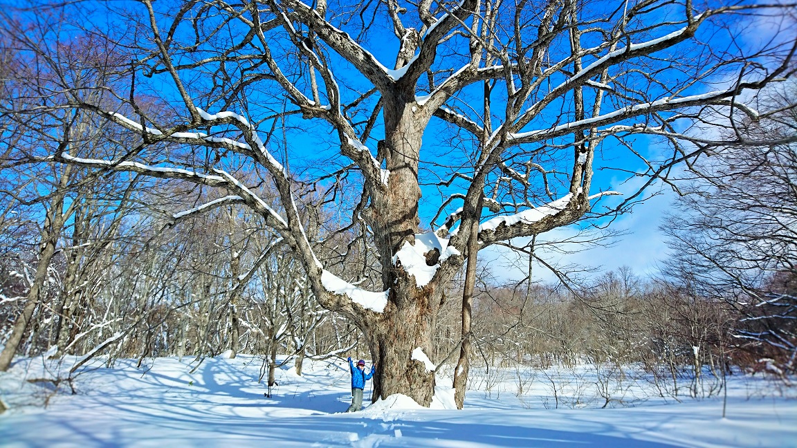 カモシカの足跡やブナの樹皮に刻まれたクマの爪痕など見どころ満載、巨樹が織りなす神聖な深い森の空気が漂う森。スノーシュー・スノートレッキング
