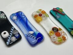 ガラスの板の色を選びそこに小さなミルフィオリとかのヴェネチアンガラスをを乗せて作るのですが、沢山の中から自分の好みで選んでデザイン出来るのがとても楽しいです。箸置き作りは特に980円とお安い値段で1時間位なので手軽に出来ます。出来たものは後日送られてきます。