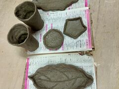 粘土量は十分にあり、2人でビアグラス大・木の葉型の中皿・小皿が2つずつ作れました。