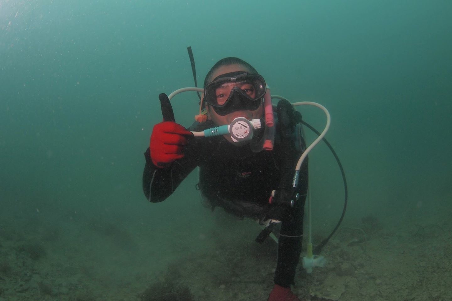 そんな不安を少しでも解消できるように、スタッフが丁寧にご指導いたします。スクーバを付けて、