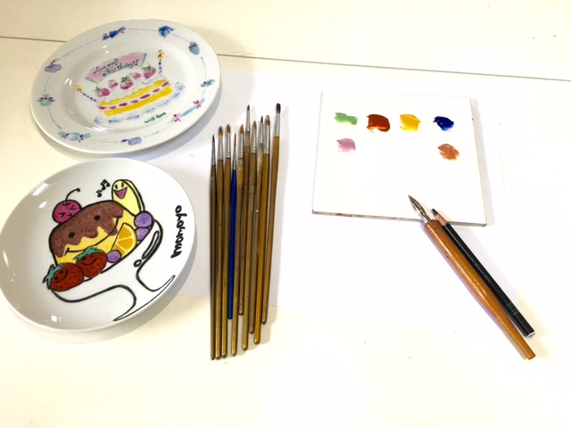 青い玉葱では、オリジナル絵具と筆でお好きな絵をお皿に描いていただきます!