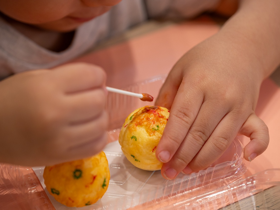 焼き目をつけた生地にネギや紅ショウガを描き、たこ焼きソース風塗料と青のりで仕上げます。2個制作できるので達成感も◎!