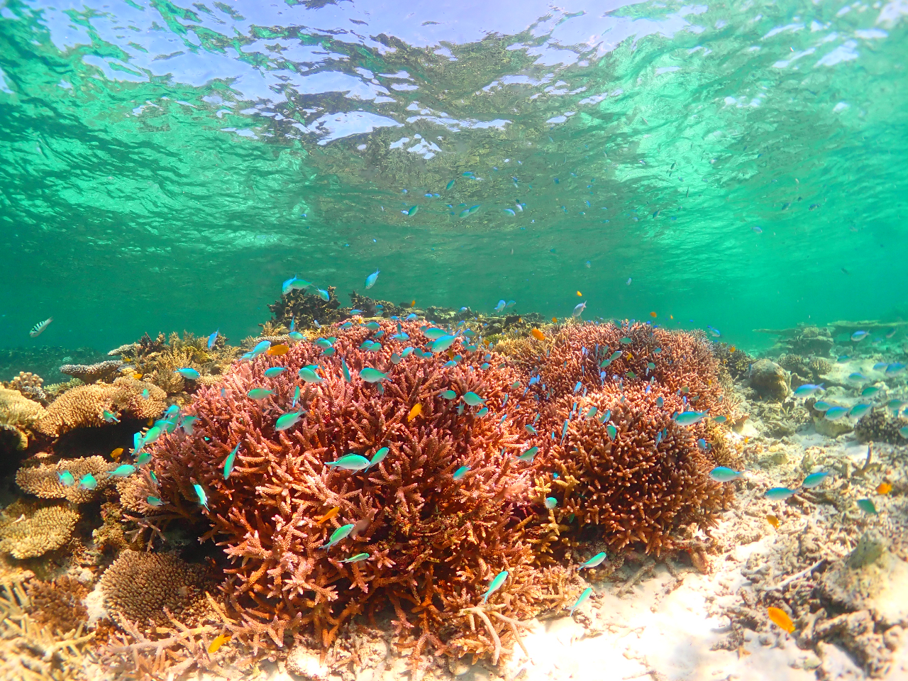 生き生きと広がる美しいサンゴ、色とりどりの魚達が出迎えてくれます。