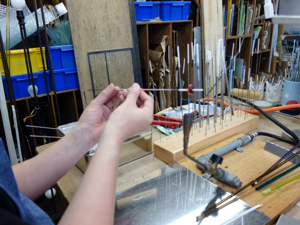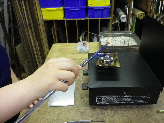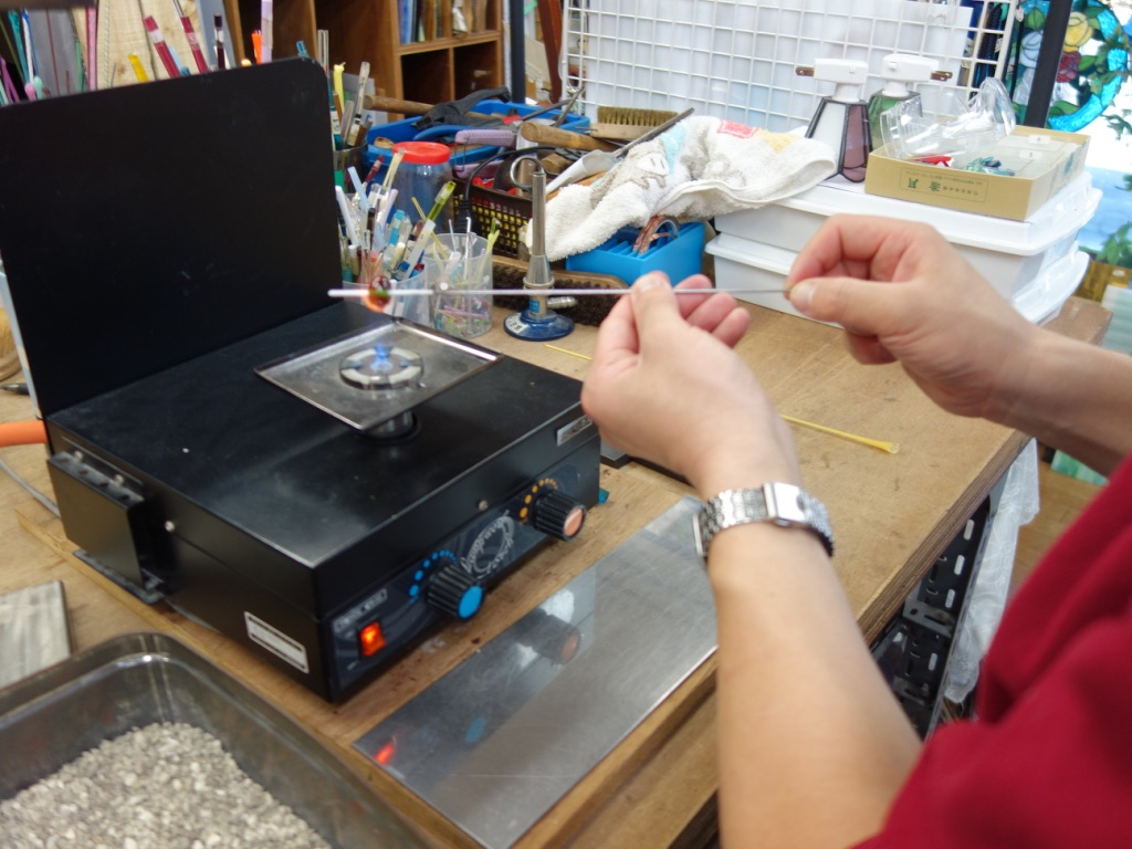 • ガラス棒を選んでバーナーで溶かしてステンレス棒に巻き付けます。