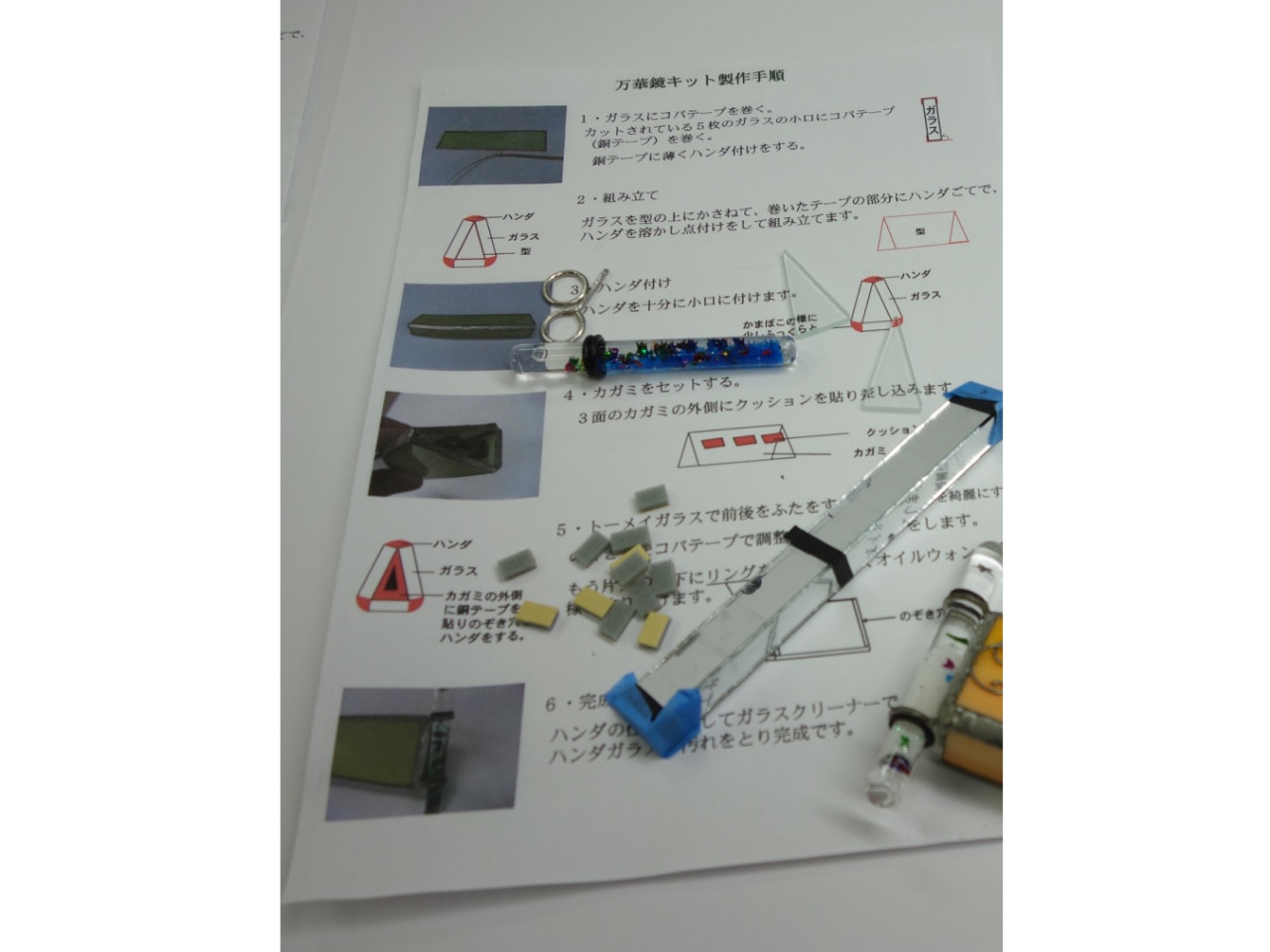 製作キットを利用しますがお好きな色のガラス棒を選んで頂けるので色の組み合わせでオリジナル感溢れる素敵な万華鏡に♪♪