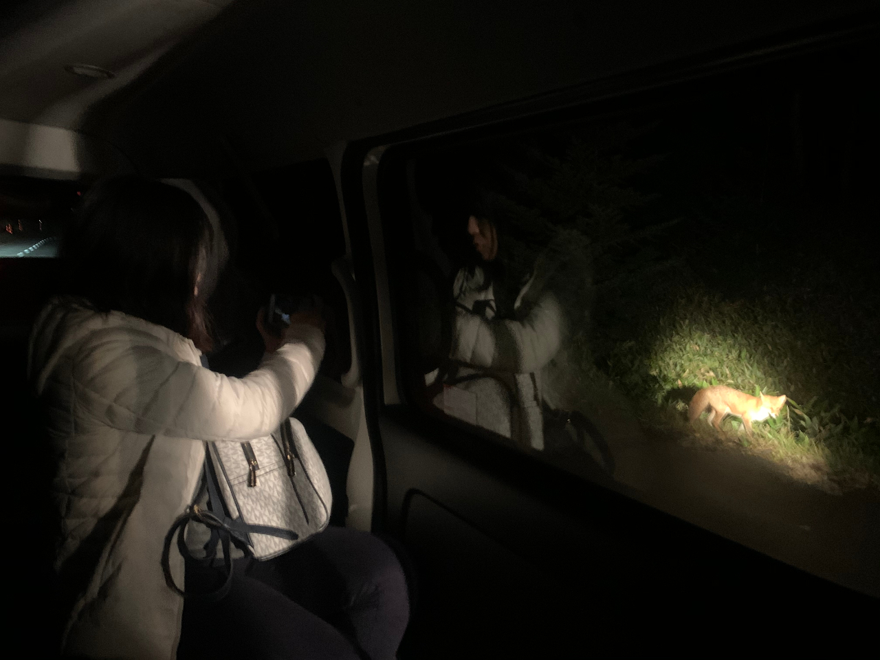 知床半島の夜。街灯一つない真っ暗な道を車に乗ってご案内します。野生動物を探したり、好天の日は満天の星空を見上げたり。車でのご案内なので気軽にご参加いただけます!