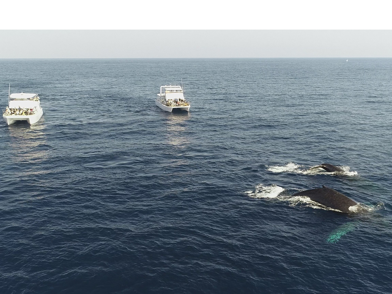 揺れに強い双胴船(カタマラン船)は、ホエールウォッチングに最適♪見やすいデッキなので、お子様連れでもご満足いただけます♪