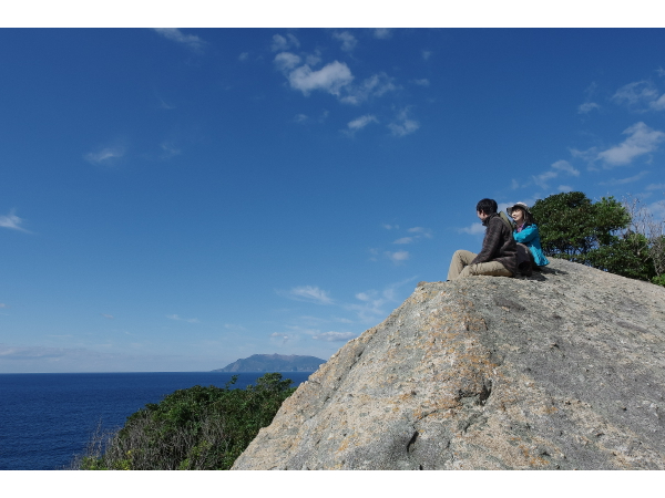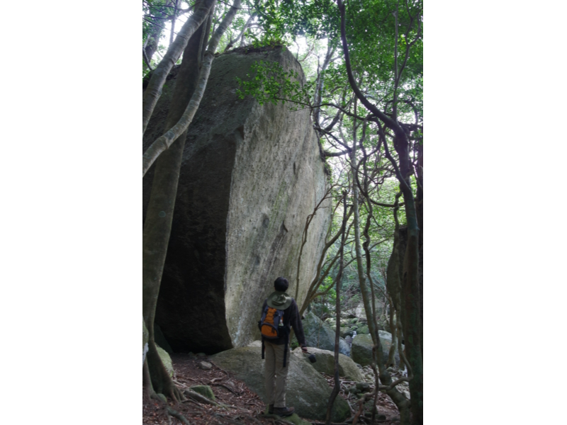 大岩でひと休み。後ろには世界自然遺産の森が広がっています