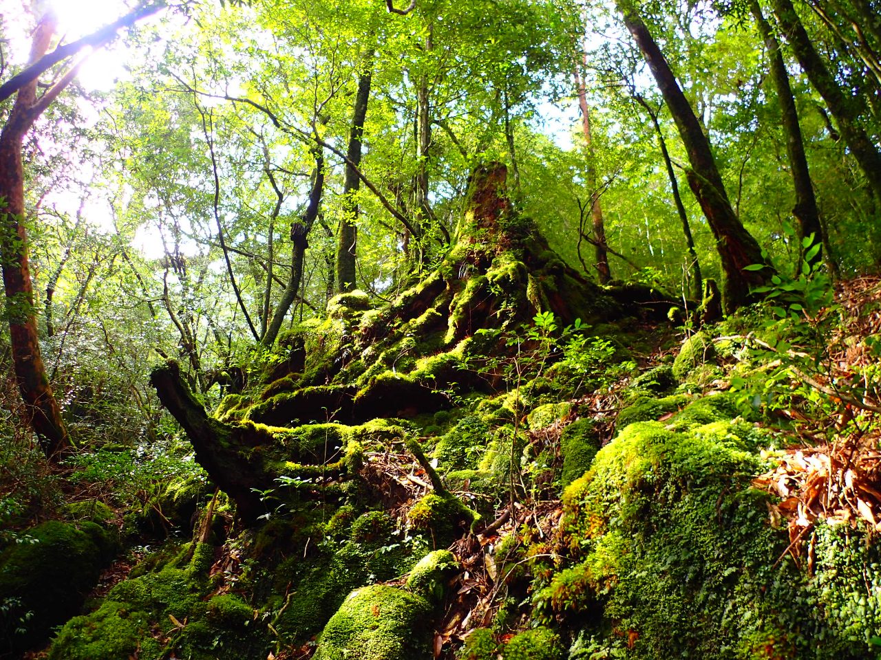 海岸から山頂部まで途切れることなく広がり続く照葉樹の森は絶景!西部林道には、存在感たっぷりの巨樹が静かにたたずんでいます。