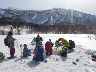 2〜3時間程度のハイクの後は、雪のテーブルと雪のイスを作っておやつタイム♪〜スノーシュー・スノートレッキング