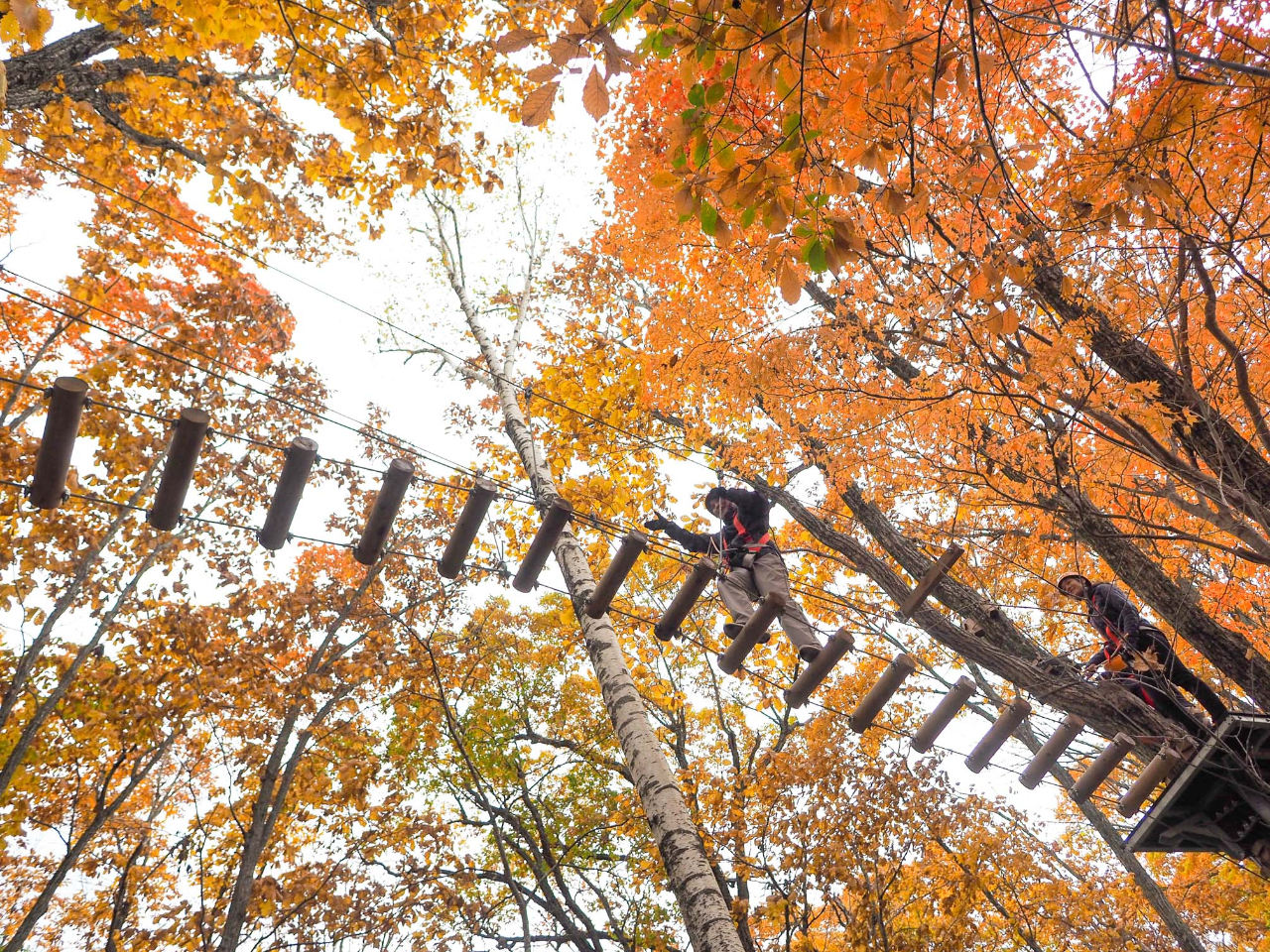 樹上のハイロープコースのエレメントとジップラインをクリアしながら、森の中を移動します。ハイライトは、沙流川を渡るジップライン!ジップライン