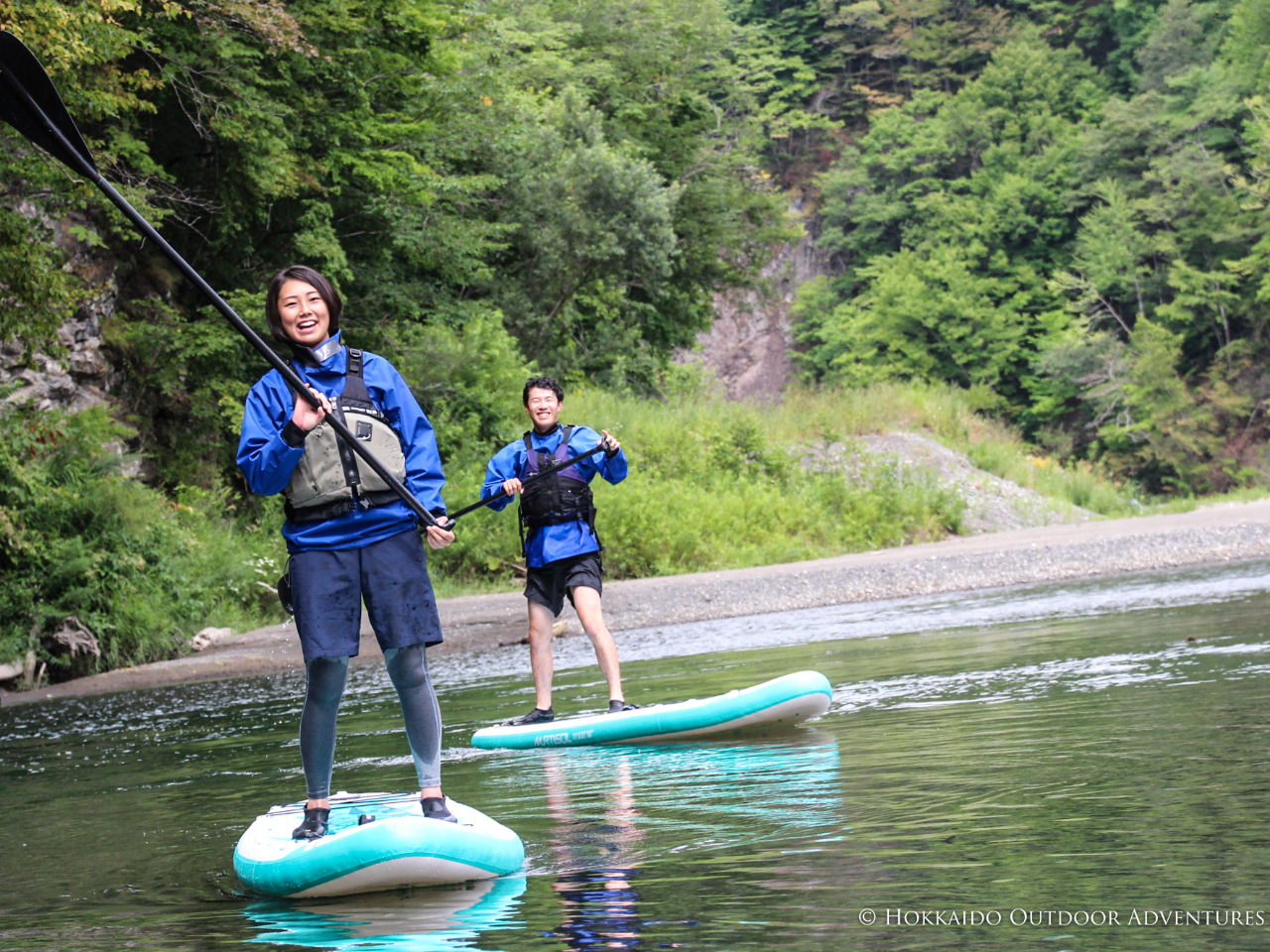 清流・沙流川を下るSUP。渓谷に囲まれた、流れの緩やかなコースを設定しており、初心者でも安心。美しい渓谷の景色を楽しむリラクゼーション、そして、バランスを取ることで体幹も鍛えられるエクササイズ効果も!