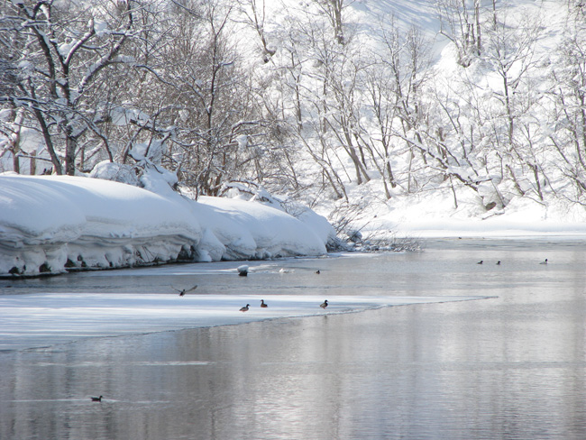 雪は音を吸収するので、川の世界はとっても静か。。流れの途中には岩に積もった雪がぽこぽこと現れ、まるで白いマッシュルームのようです。そんな幻想的な雰囲気の尻別川をゆっくりと流れましょう。
