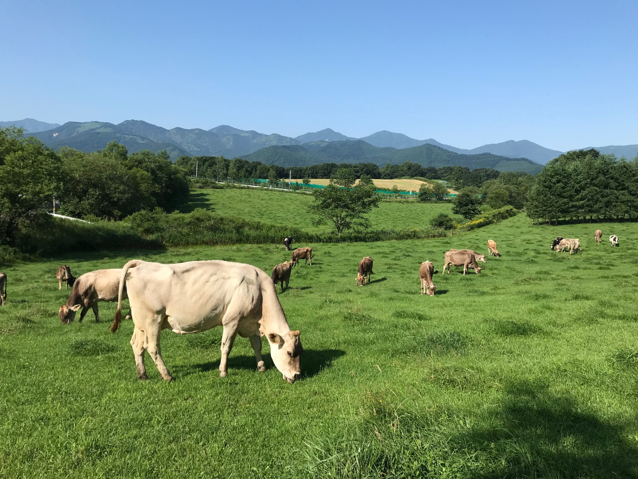 予約した日の放牧が少し奥地だったため、雪 が残る山を背景に牛さんたちと戯れることが出来ました!