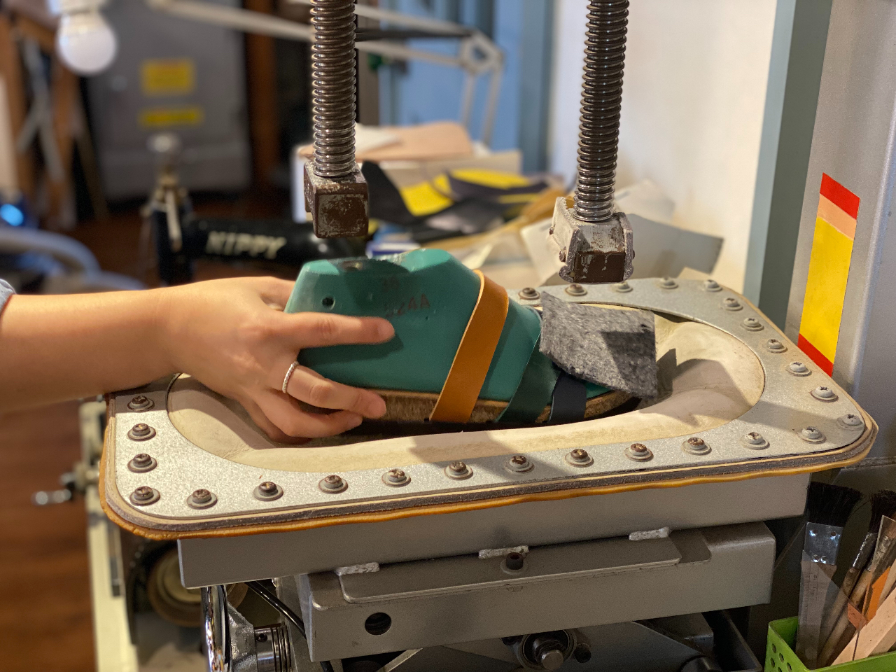 プレス機でソールをしっかりつけます