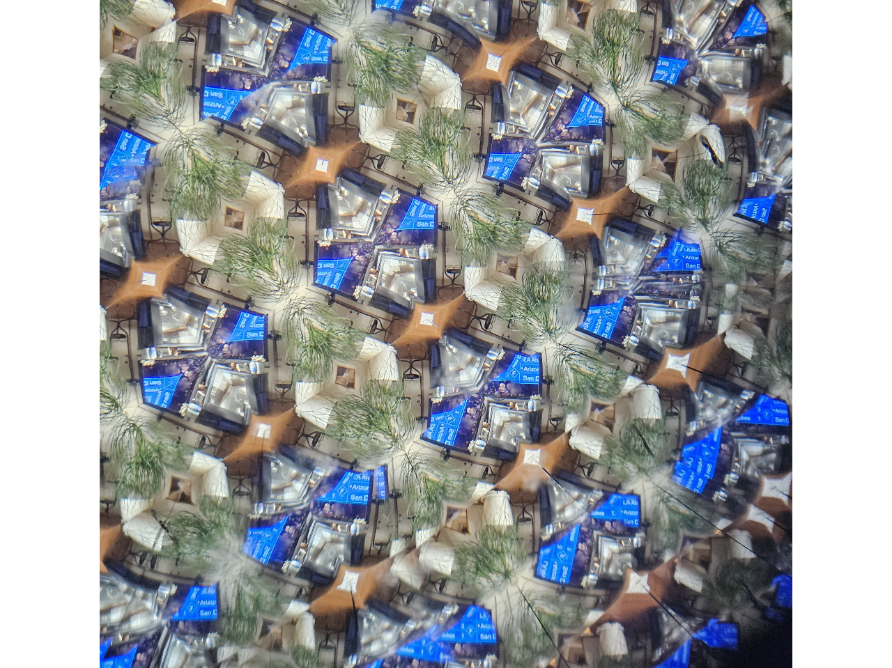 また、万華鏡展示スペースでは1時間おきに約5分間ずつ投影式万華鏡をご覧いただけます。展示室内の天井・壁面に万華鏡が映し出され、幻想的な世界をお楽しみいただけます。