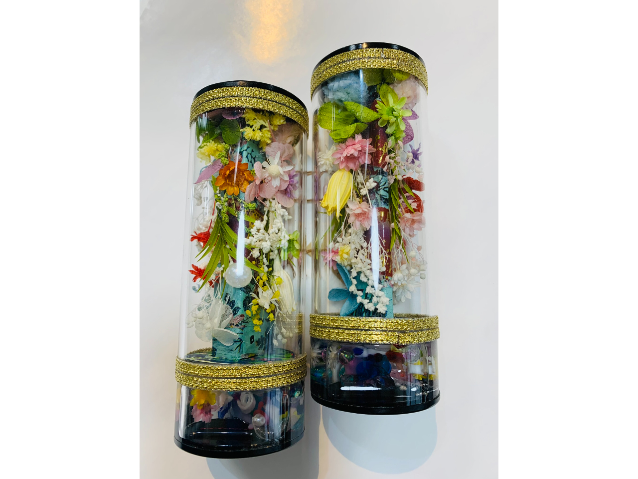 筒の中にプリザーブドフラワーを飾り、お好きなビーズを選んで入れる、