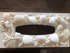 たくさんの貝殻からイメージに合うものを選び、作品製作にかかります。私は元々店内にあった貝殻のティッシュケースに惹かれ、そのデザインをもとに作られていただきました。