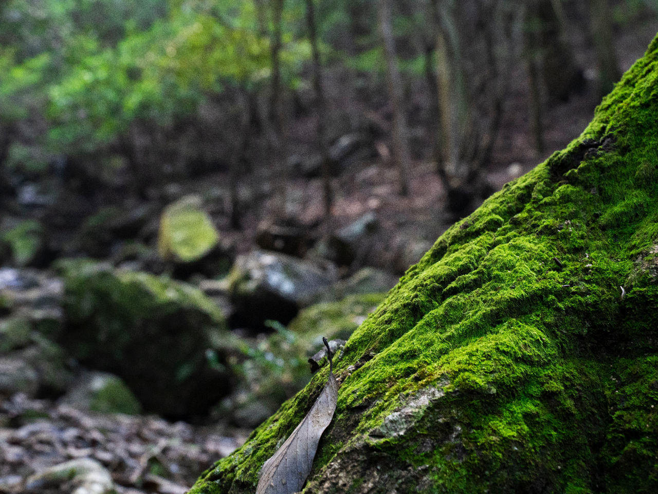 森の中、川のせせらぎと緑の美しさに心から癒される。