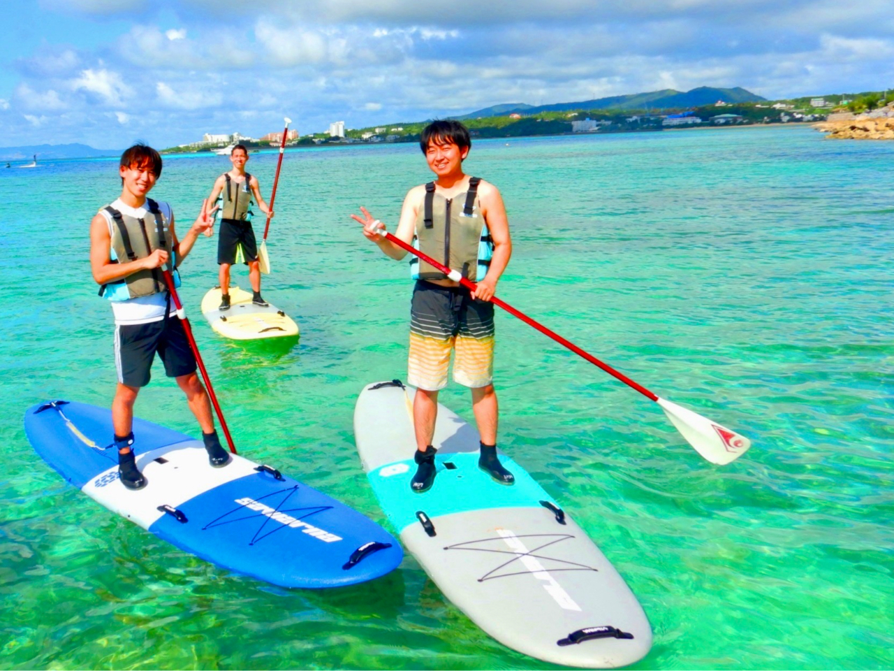 下が砂地だと海はエメラルドブルーになっています。どうせなら沖縄の海でSUP体験、おすすめです!