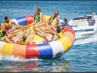 水上バイクでハリケーンボートを引っ張り、水の上を回転する新感覚のアクティビティ!ヘルメットのレンタル料込みのプランです。