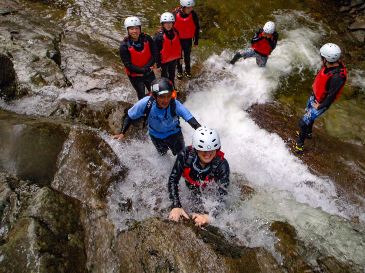 キャニオニングは沢下り、シャワークライミングは沢登りと思っています。ジャグスポーツでは二つの要素を含んだ「登・遡・滑・泳・跳」 ありの体験ツアーを開催しています
