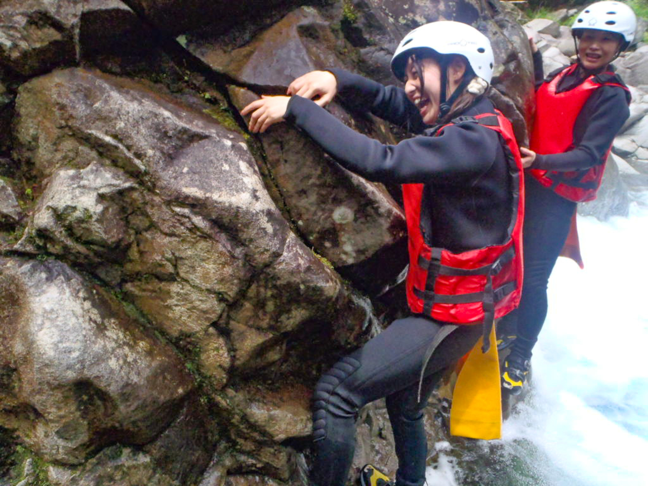 キャニオニングコースには、へつりポイントがあります。もし、岩場から落っこちたら、滝つぼにドボンの心躍るドキドキ体験があります。