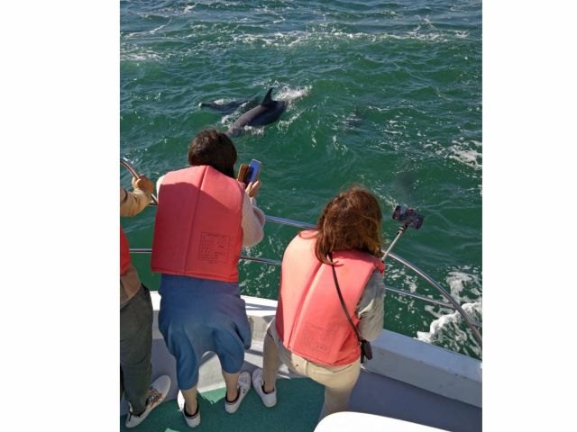 古くからイルカとともに漁をしてきた漁船のエンジン音に引き寄せられ、イルカたちが間近まで寄って来てくれます。
