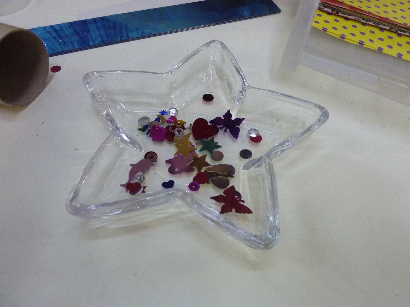 粒状のガラスとさまざまな形のスパンコールを使って、