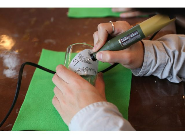7歳から体験できます。工房で作ったグラスに文字や絵を掘り入れてみませんか?型紙もあるのでガラス越しになぞって削り入れていきます。