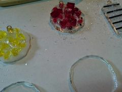 当工房ではいつでも体験制作ができます。作れる物は10p角ガラスタイルを一枚、またはペンダントヘッドを三個です。かかる時間は一時間程度です。料金はお一人様¥2500(送料込み)です。ガラスタイルの作業工程は紙にデザインを描くところから始まり、次にデザインの上に10p角のクリアのガラスをのせます。そしてその上にいろんな色や形のガラス素材を並べて行きます。ガラス素材の中には細い棒や砂状または粒状のもの、ビーズ状、板状などのものがあるので、どのようなデザインにも対応できます。ペンダントヘッドもほぼ同じような作り方です。
