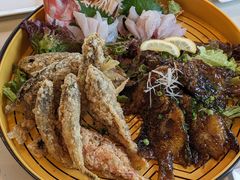 色とりどりのカラフルな魚がたくさん釣れて、釣った魚は近くのレストランで刺身と煮物と揚げ物に。