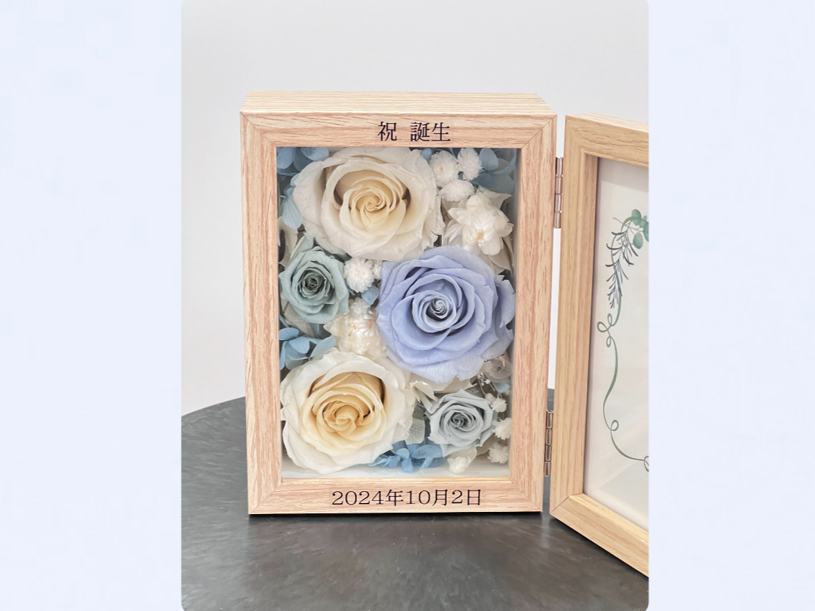 福岡市「プリザーブドフラワーで作るフォトスタンドレッスン」プレゼントに最適なLサイズの写真立てのワークショップ!出産お祝い 結婚お祝い 誕生日祝い 還暦 卒業祝いなど贈り物に最適!女性に人気です